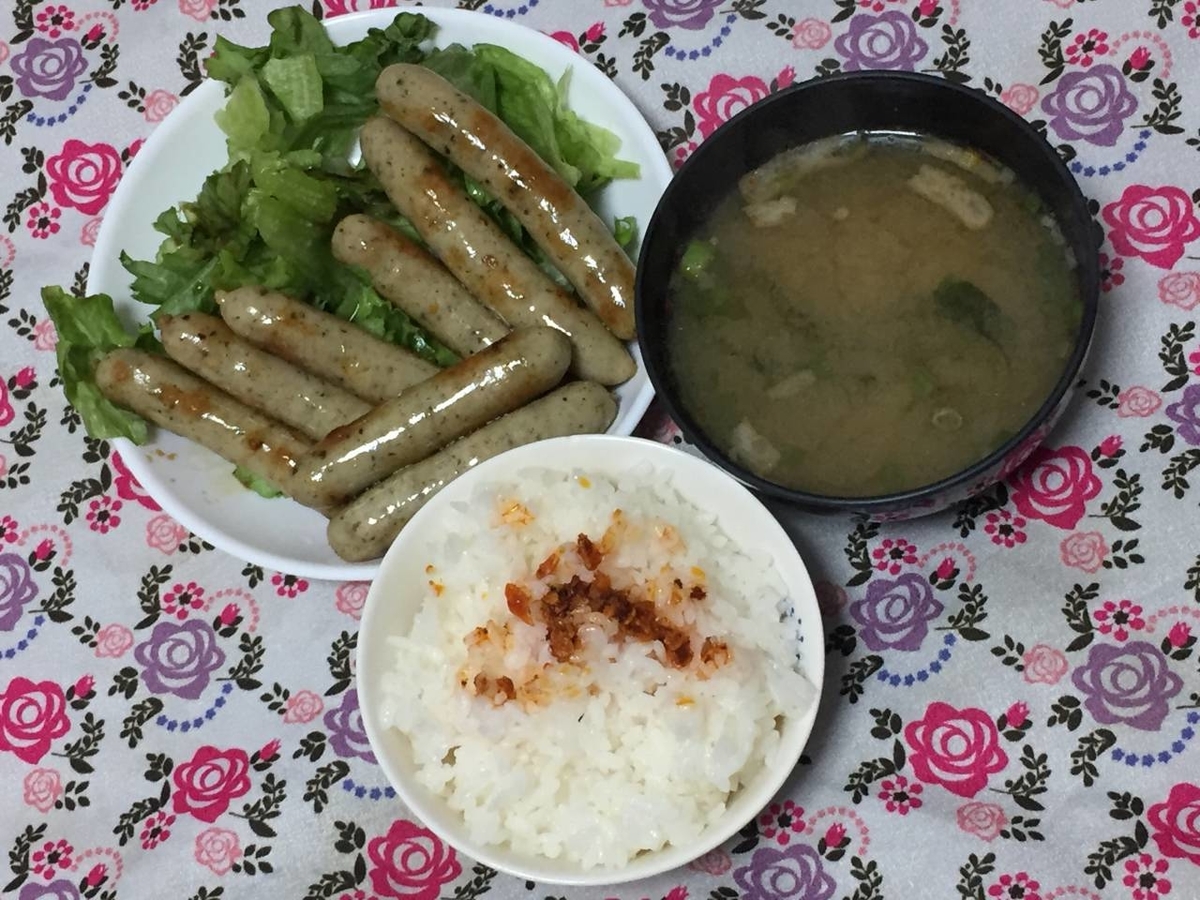 今日のあさごはんはウインナー!レタス!みそ汁!ご飯には食べラーだ!