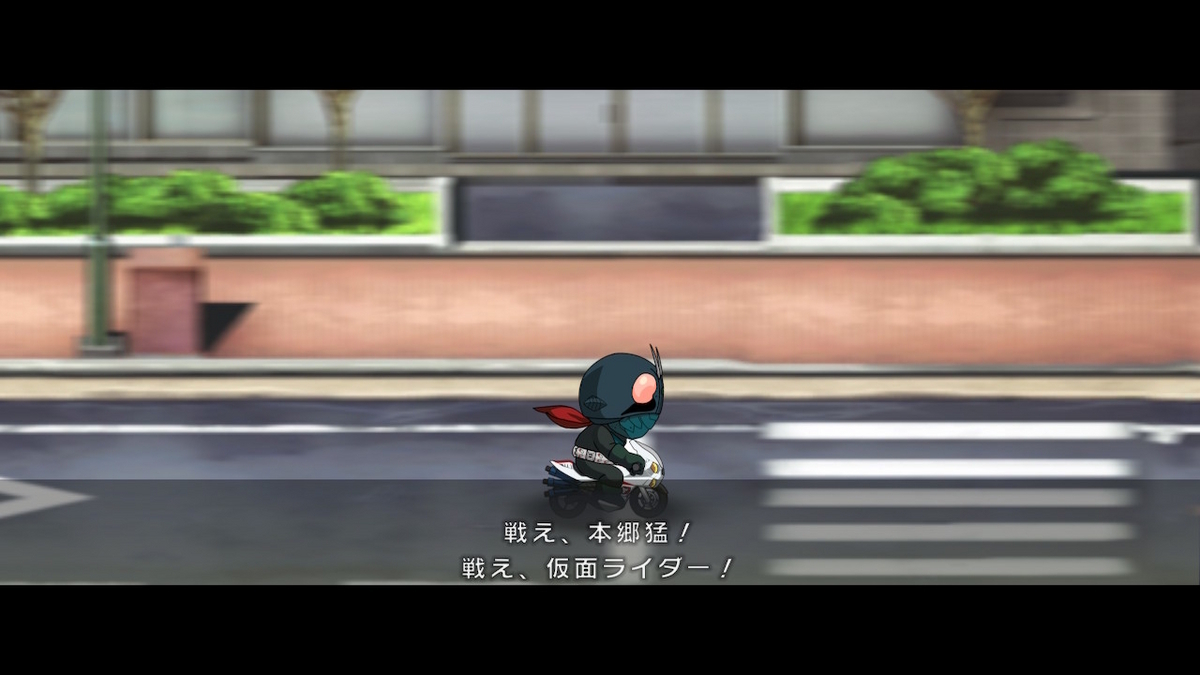 かわいいSDキャラになったライダーが豪快に戦う2Dのアクションゲームで、