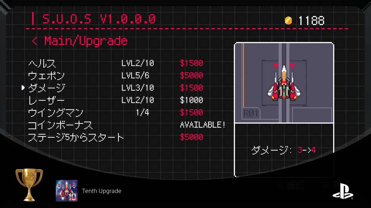 敵を倒すと溜まっていくコインを消費して耐久度やショットの広さ、オプションなどを強化可能だ。何度もプレイすればどんどん強くなって楽になっていくのだ。