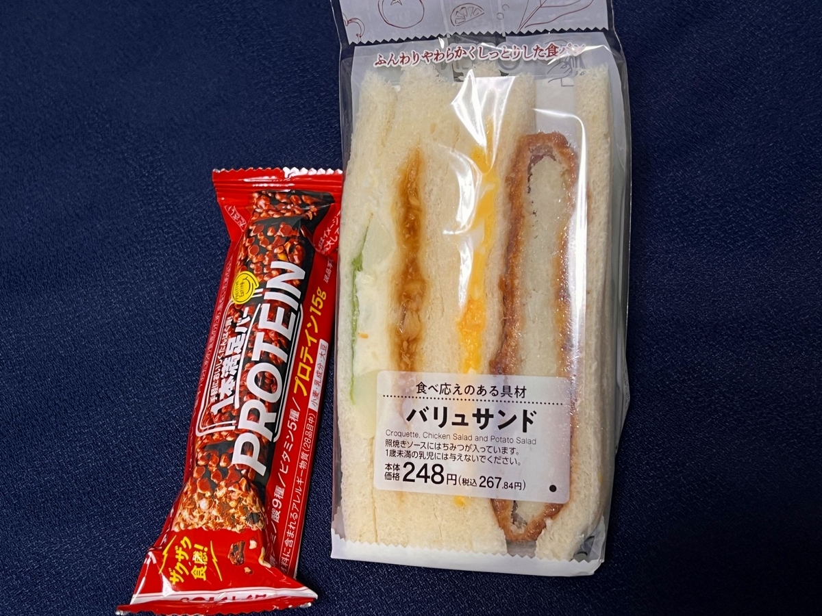 12月14日のあさごはんはサンドイッチと一本満足バーだ。サンドイッチは267円にしてはボリュームある。