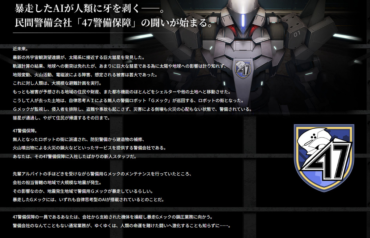 そんな世界観でプレイヤーは民間警備会社「47警備保障」の新人。無人の街の防犯や建造物の補修をするアットホームな職場のはずだったが、原因不明の暴走を始めたAIロボとの戦いに巻き込まれていくことになる。
