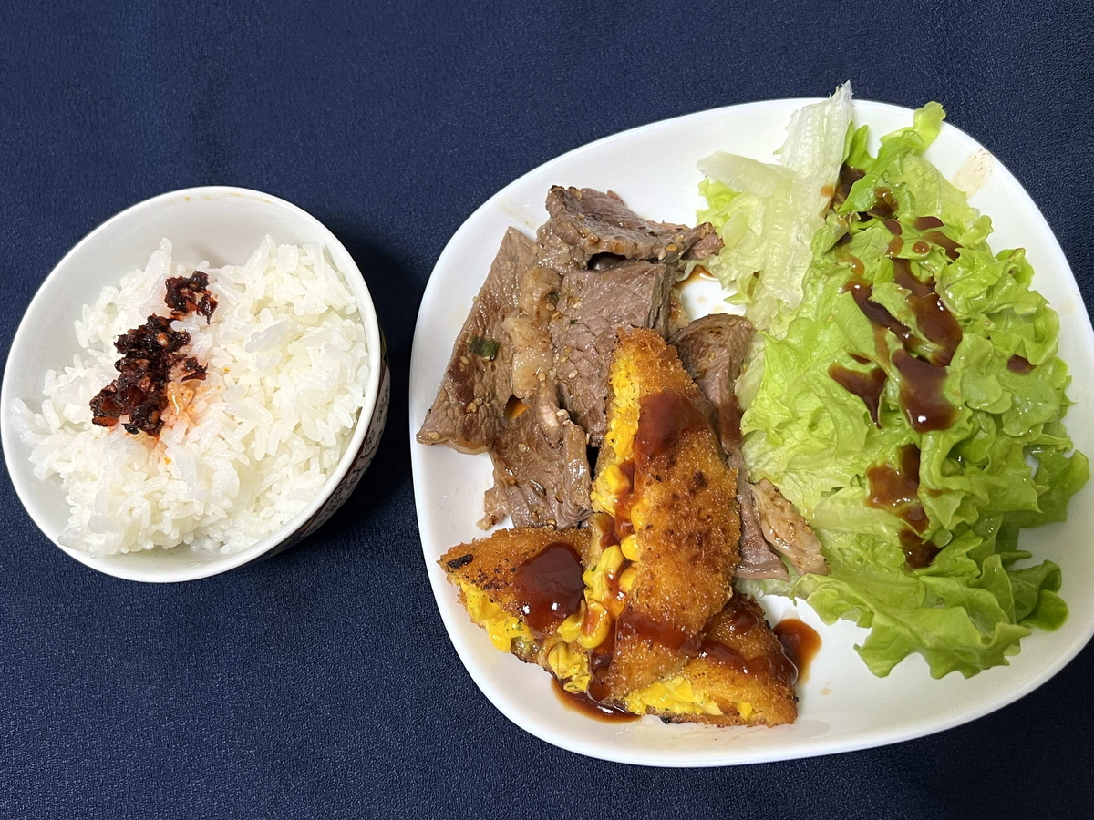 7月7日のあさごはんは368円くらいの安ステーキと、前日の晩御飯の残りのコーンコロッケ。どちらも結構うまかった。