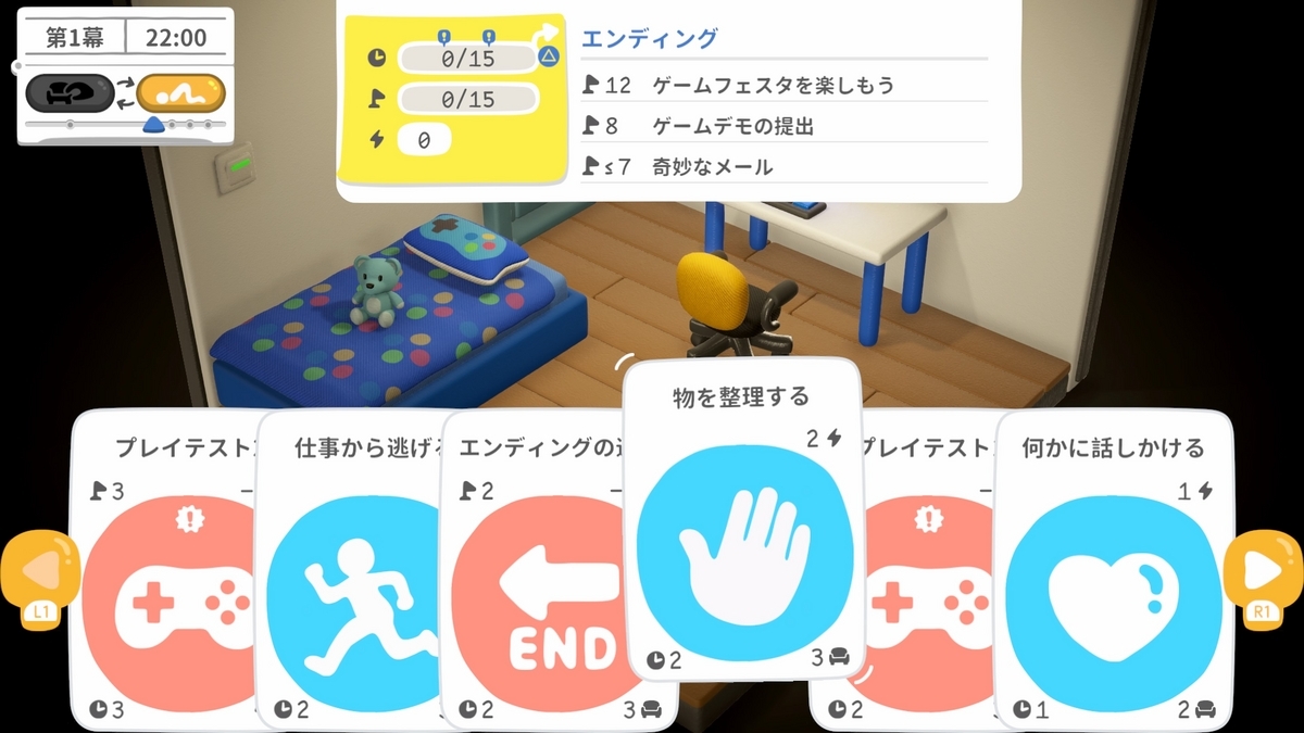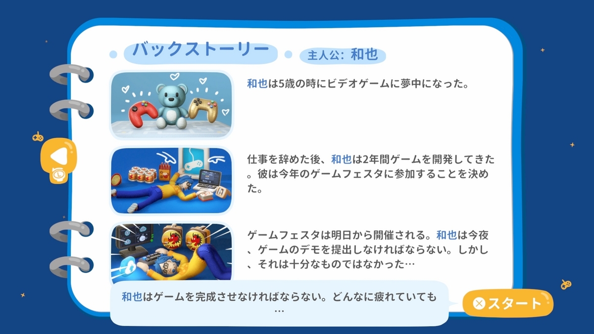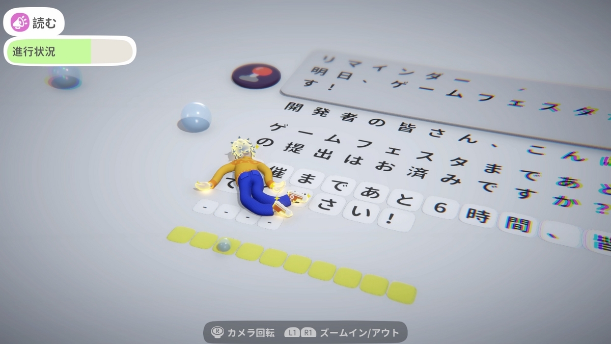 疲弊して床を這いずり回りながら、明日のゲームフェスタに提出するゲームを作るのが目的となる。バグ取りやパッケージ制作までやるから大変なスケジュールである。