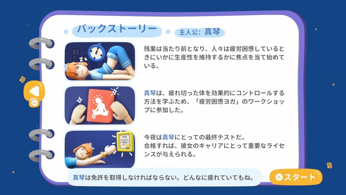 チュートリアルは女の子のヨガ真琴を動かせるが、本編が始まると疲弊したゲームクリエイターのおっさんをずっと操作するぞ!おい!話が違うぞ!