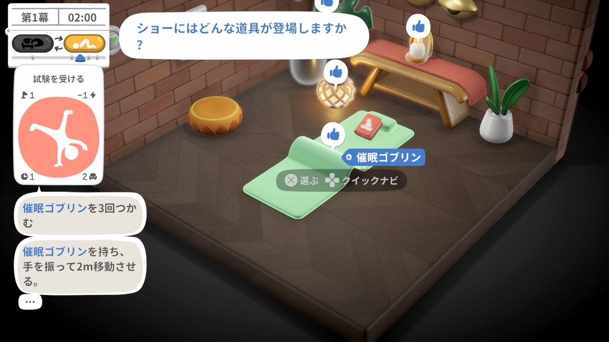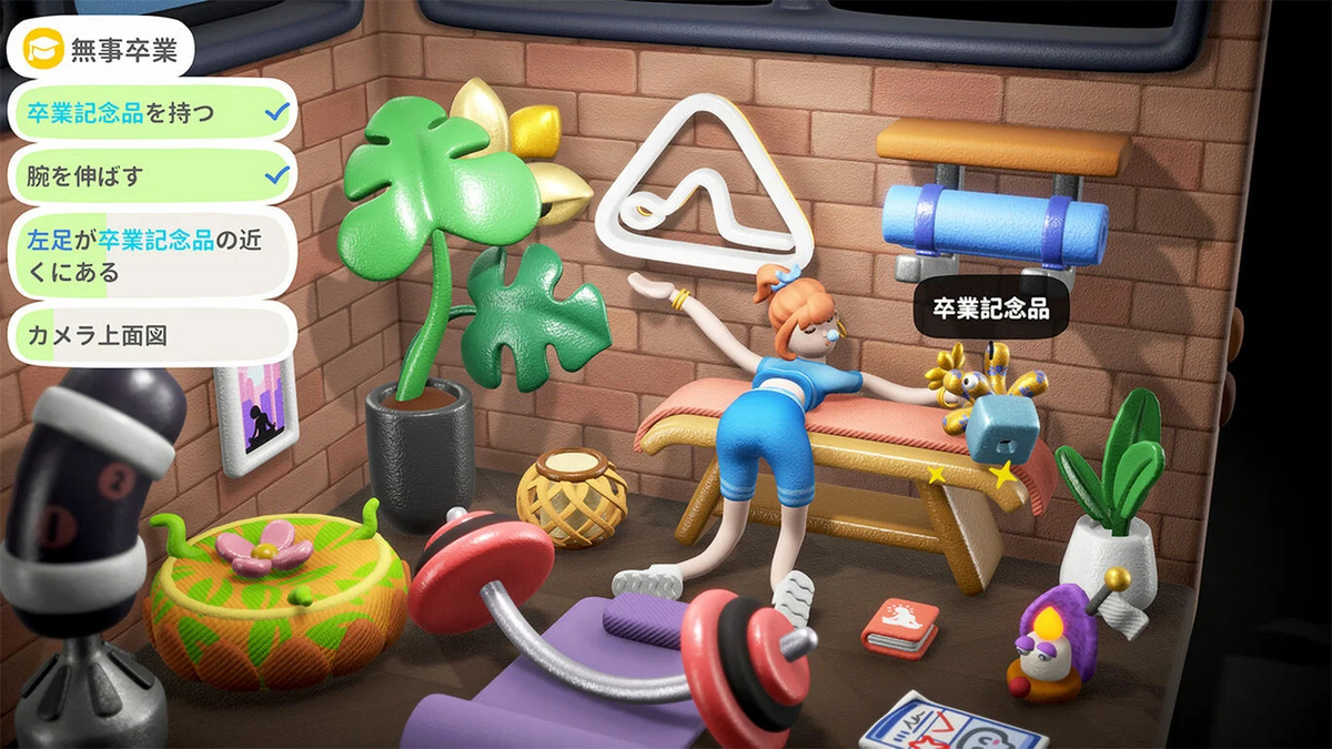 お題は「〇〇を〇〇の横に置け」「〇〇を〇〇メートル動かせ」「右足を〇〇に触れさせる」「高いところにある〇〇を掴め」などなど。複数の条件を同時に満たさないとクリアにならない場合もある。