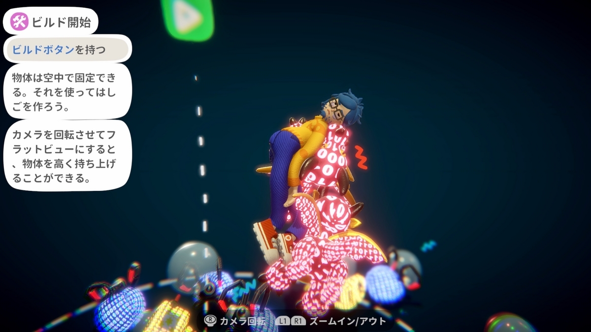 スティックで移動、スティック+ボタン長押しで左手、右手、左足、右足を個別に動かせる。移動は壁も這いずり回れるし、掴んだ物を空中に固定することも可能だ。疲弊してるけどクモみたいな動きは出来る程度の疲弊。