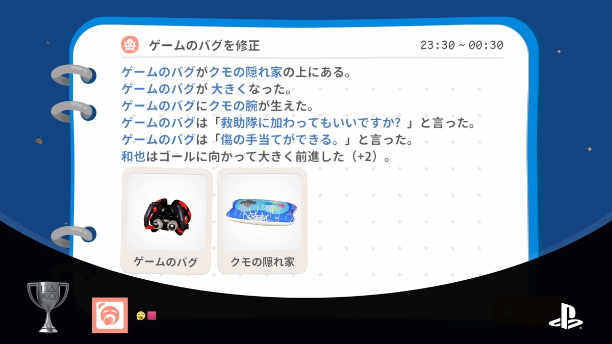 絶対置かないといけないオブジェもあり、お邪魔キャラである「バグ」が配置されたり喋ったりする場面も。こいつ……疲弊し過ぎて幻覚が見えてる!