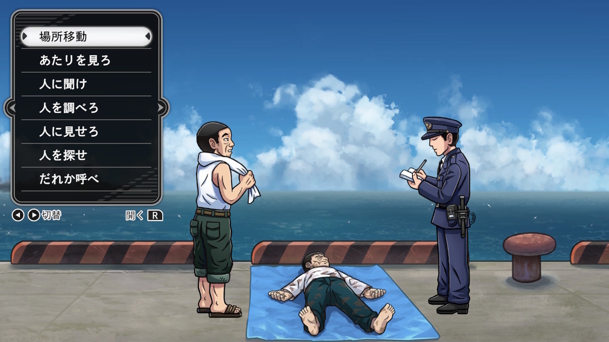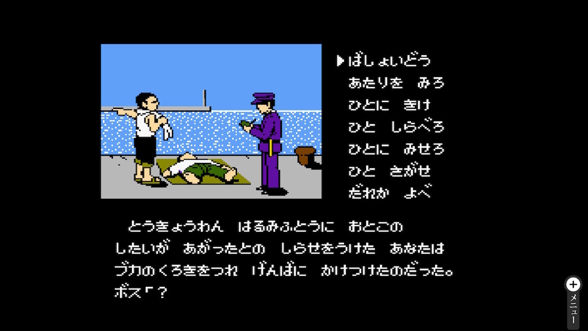 ゲーム自体は昔と同じ由緒正しいコマンド式のアドベンチャーゲームだ。あちこち移動して聞き込みをし、画面内を調べて証拠品を集めて物語を進めていく。主人公はドラクエよろしく喋らず、相棒であるシュンに行動を指示をする形で進行していくぞ。