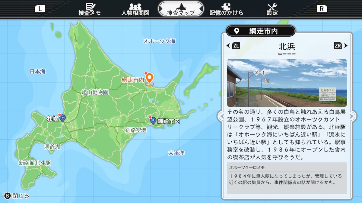新要素として、観光マップ……じゃなかった捜査マップが追加。行ける場所が増える度に更新され、解説テキストが読める。元々北海道各地の有名所を巡るストーリーだったが、更にご当地感アップだ!