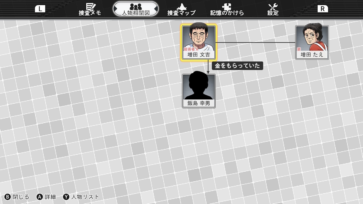 ゲーム進行に合わせて細かく更新される人物相関図も凝ってる。新情報でレイアウトが大きく変わったりするので、事件を整理するのにピッタリ。