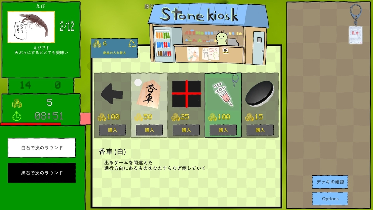 キーホルダーは売るまで永続で効果があり、特定条件でのポイント倍率や、ひっくり返せる枚数などにも関わってくる強力なもの揃いだ。購入すると画面右側のスペースにぶら下がっていくのが、見た目的にも楽しいぜ。
