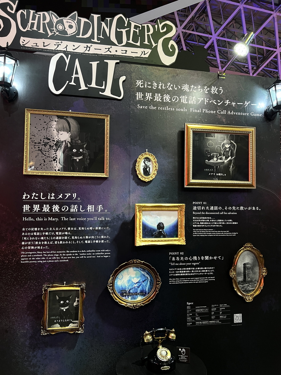 世界最後の少女になって電話で魂と話すゲームなので、電話のオブジェが置いてある。触るのも自由になっていた。全体的に作品の雰囲気を大事にしてあって、品のあるブースって感想になるね。