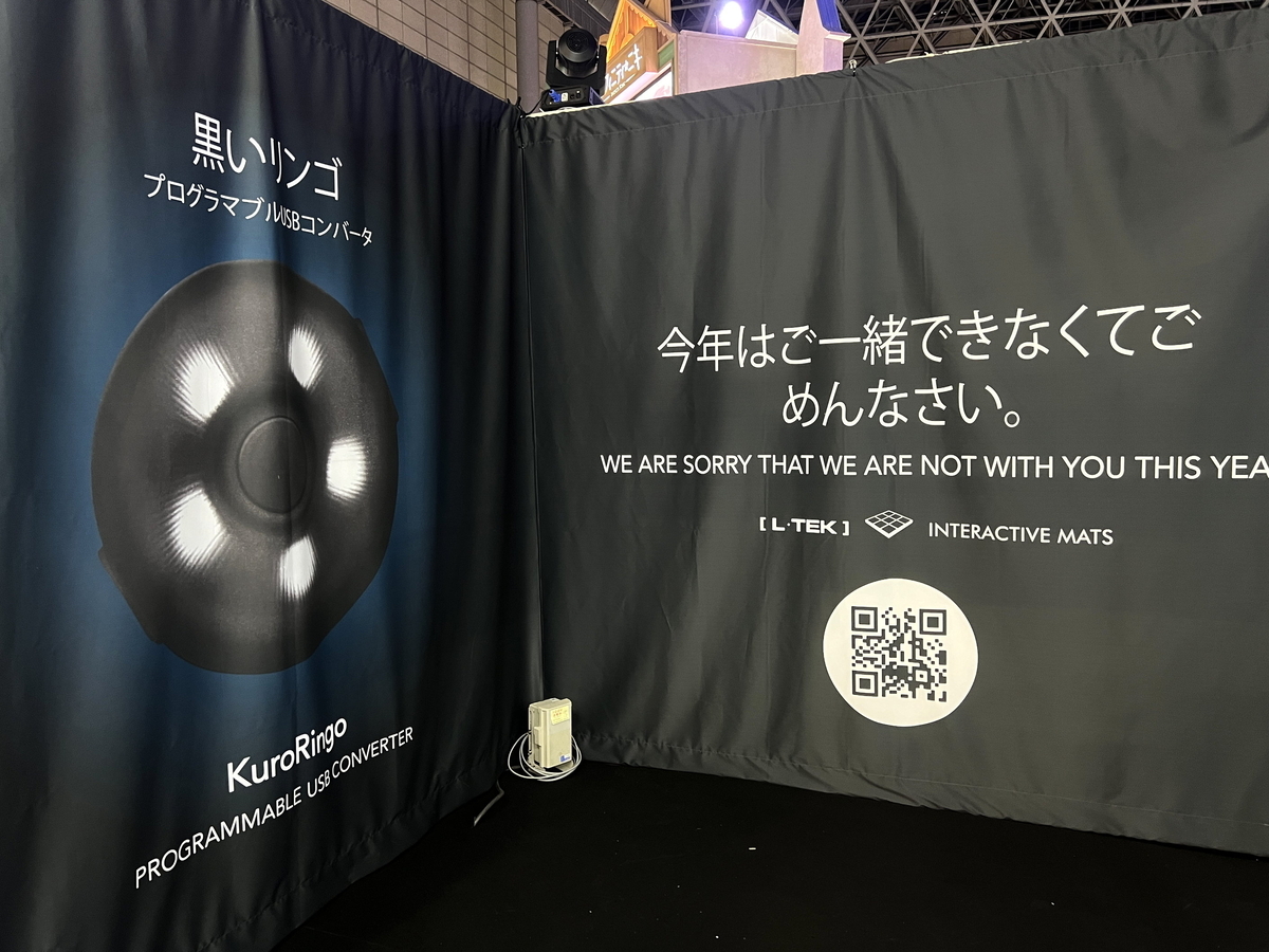 ニキ付近で見かけた謎のブース。改行の怪しい「今年はご一緒できなくてごめんなさい。」のメッセージと暗幕だけのスペースだった。この写真がブースの全部。なんなんだろう……。