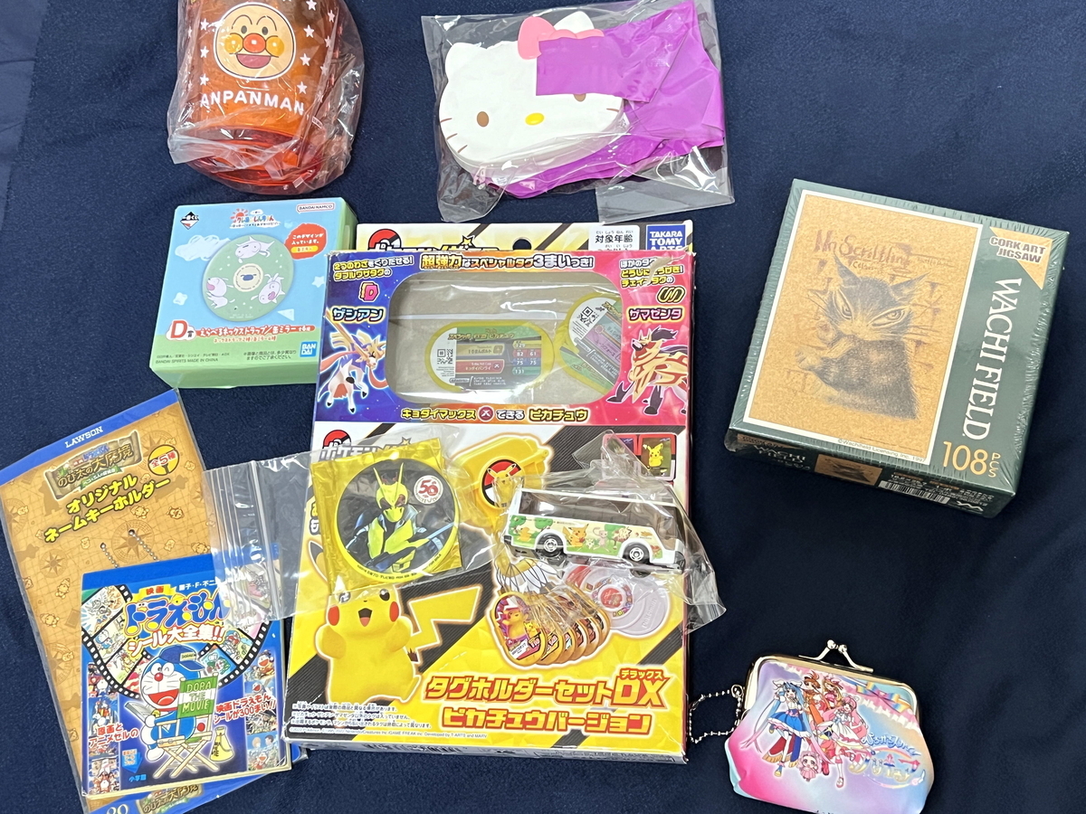 ポケモンメザスタのタグホルダーセットにプリキュア、クレしん、アンパンマン、キティちゃんなどのグッズ色々。仮面ライダーゼロワンの缶バッジも!