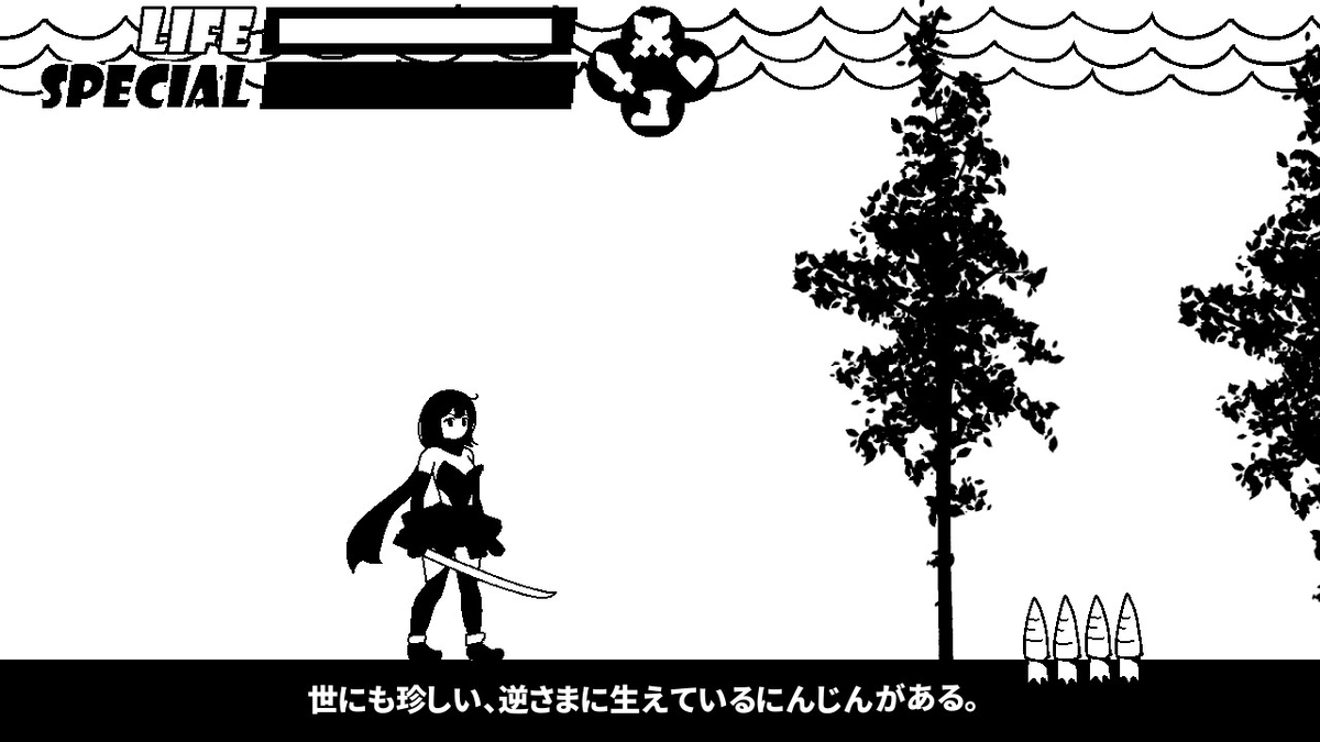 トゲじゃなくて「世にも珍しい、逆さまに生えているにんじん」だったり。世界観やテキストはゆるめ。こういうくだりがちょこちょこ挟まるので、アクションパートも飽きずに進められる。