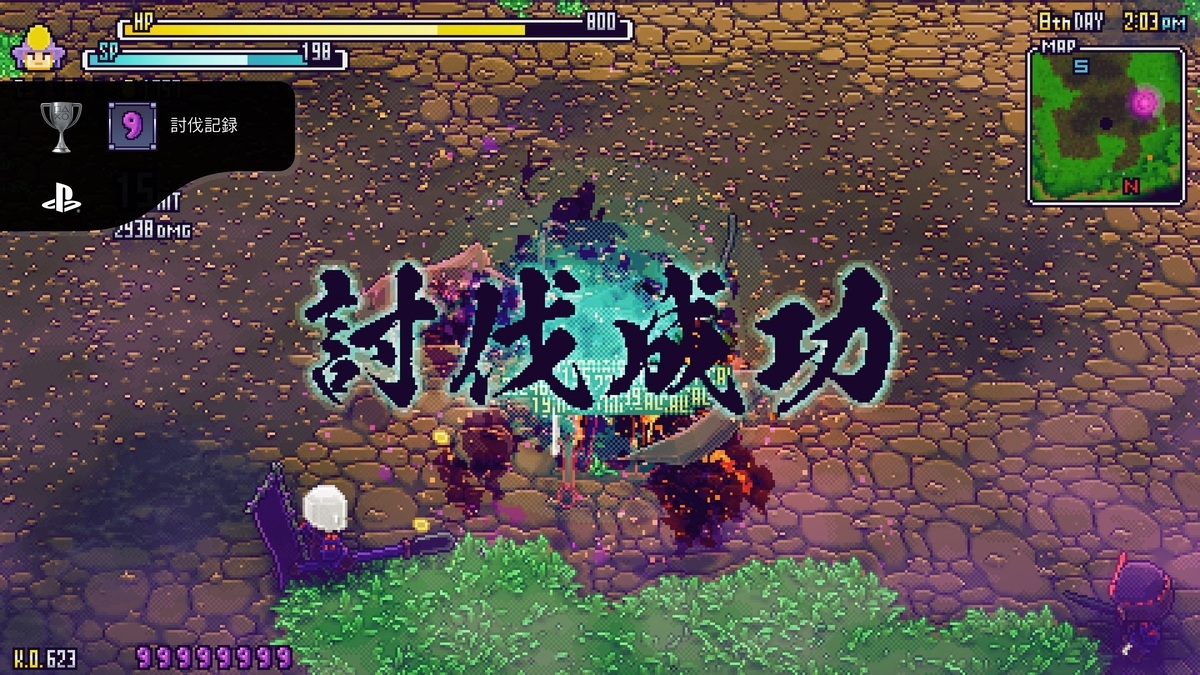 「戦技の巻物」は戦ってるとどんどん集まるし、ゲーム内実績を解除することで、最大体力やSPゲージの最大値などの底上げもされていく。これらはゲームオーバーになっても引き継がれるので、繰り返しプレイすればするほど、最初から高火力を叩き出せるようになるゲームってわけだ