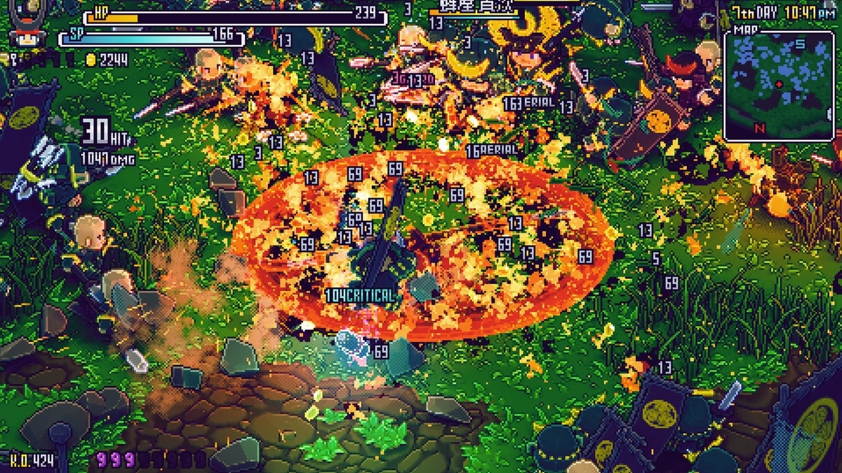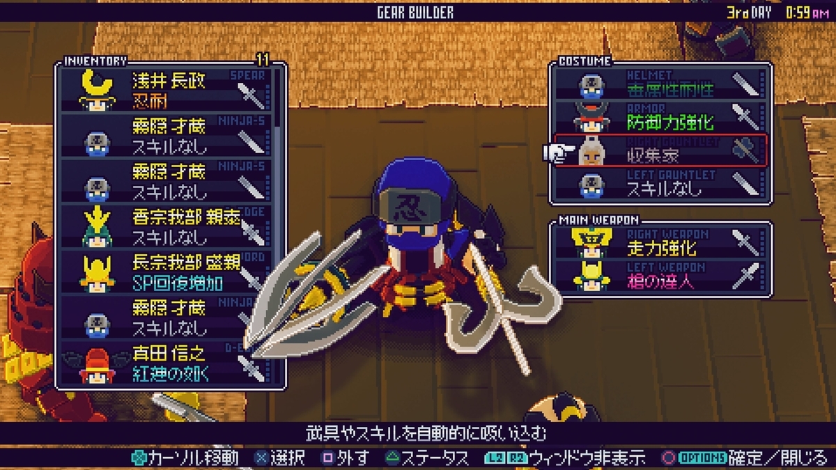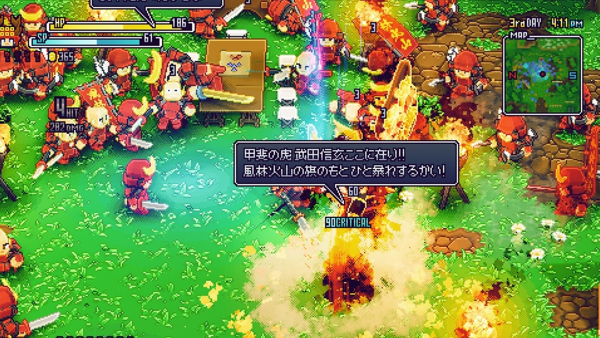 レシピ集めで派手な技が見つかると大群を圧倒できるようになり、遊べば遊ぶほどに動きがインフレしていくのが痛快!種ヶ島なんていらねぇ!俺には火炎・衝撃・五月雨・回転斬りがある!