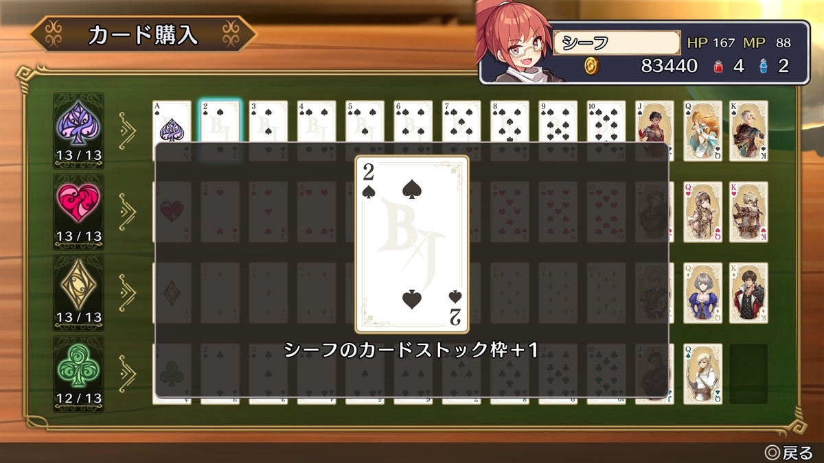 全キャラ共通で要らないカードをストックできる枠もあり、MAXで3枠まで拡張可能だ。ブラックジャックでこれは強い!絵札をキープしておくだけでも圧倒的有利になる。