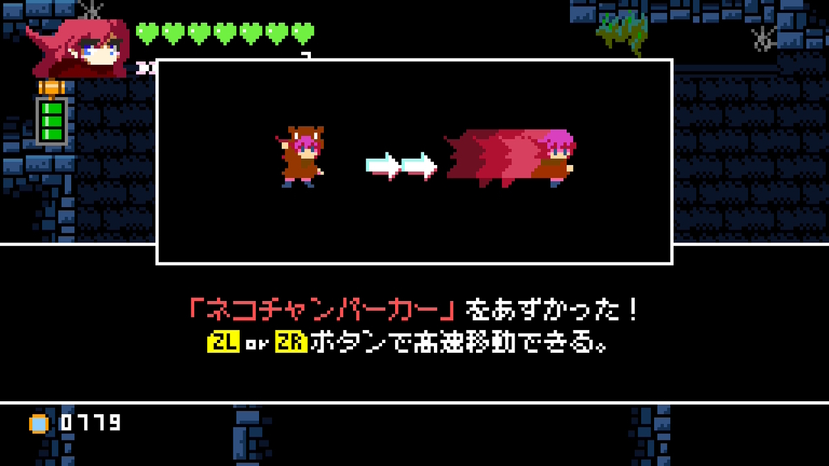 イベントで装備アイテムを手に入れると、岩を破壊できるハンマーや二段ジャンプなど、様々なアクションが増えていく。ダッシュに必要な装備が「ネコチャンパーカー」などかわいらしい。