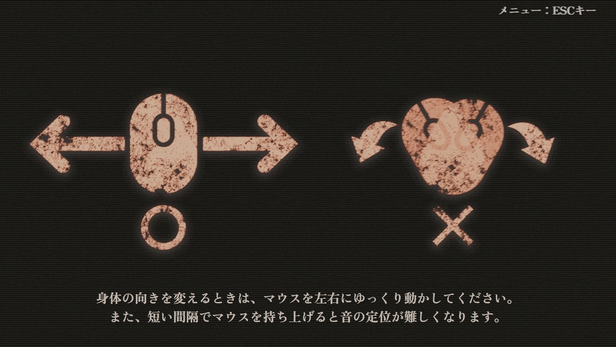 操作はマウスのみで、マウスを左右に動かして向きの変更、左クリックで前進、止まっている時に右クリックで聞こえる音の切り替えとなっている。