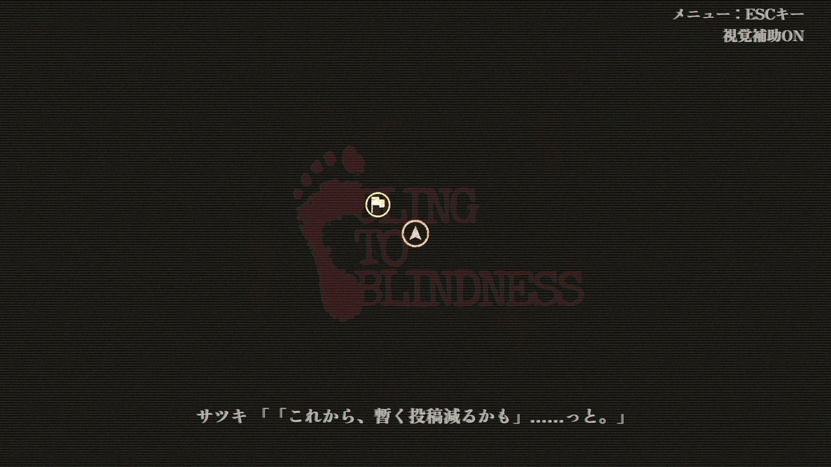 オプションで視覚補助ONにすると画面にセリフ字幕と現在位置とゴールが視覚的に表示されるので、どうしても分からない時は使う手もあるし、他の人と一緒に遊ぶ時にも有効。これを使ってゲーム実況して、コメント読み上げONにすると面白そう。第三者が方向を指示するからスイカ割りみたいになる。一人用のゲームだけどこういうところは上手い作りだ。